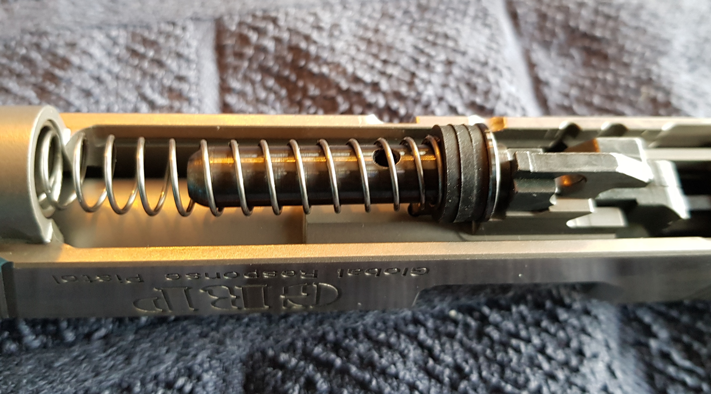 Min spontana tanke är att det sitter nått som blockar på spring guiden / retur fjädern, så den "short strokar" dvs den skjuter snabbare, men hakar inte upp. för den ska ju nästan kunna dras 1mm förbi det hacket.